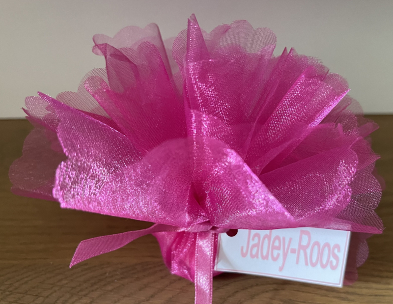 MOOIE FUCHSIA SATIJNEN TULE'S GEVULD MET ROZE/WITTE FRUITSMAAK HARTJES EEN LINTJE EN KAARTJE EMT NAAM