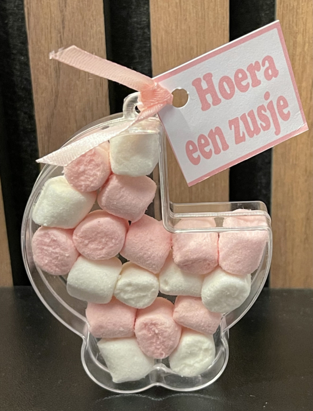 Overzichtplastic kinderwagentje gevuld met mini spekjes een lintje en kaartje